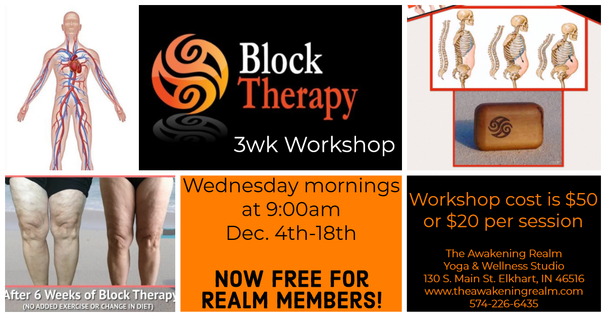 Come in casual clothes with no zippers or buttons in front and bring a mat and pillow. Cost is $20 or save money by purchasing the 3 part workshop in full for $50! Block Therapy is Now FREE for Realm Members – so sign up and enjoy this perk! We only have 10 blocks, so this class will fill up fast!