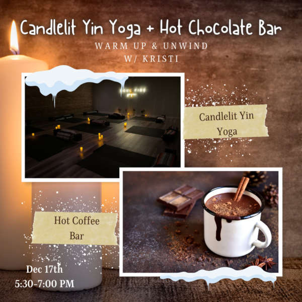 Relax and unwind with Kristi as she guides a gentle, beginner friendly, Yin Yoga class, while sipping hot chocolate by candlelight! We’ll sit in a pose and allow gravity and the breath to guide us deeper, gently stretching the tendons, ligaments, and deep muscle fascia.