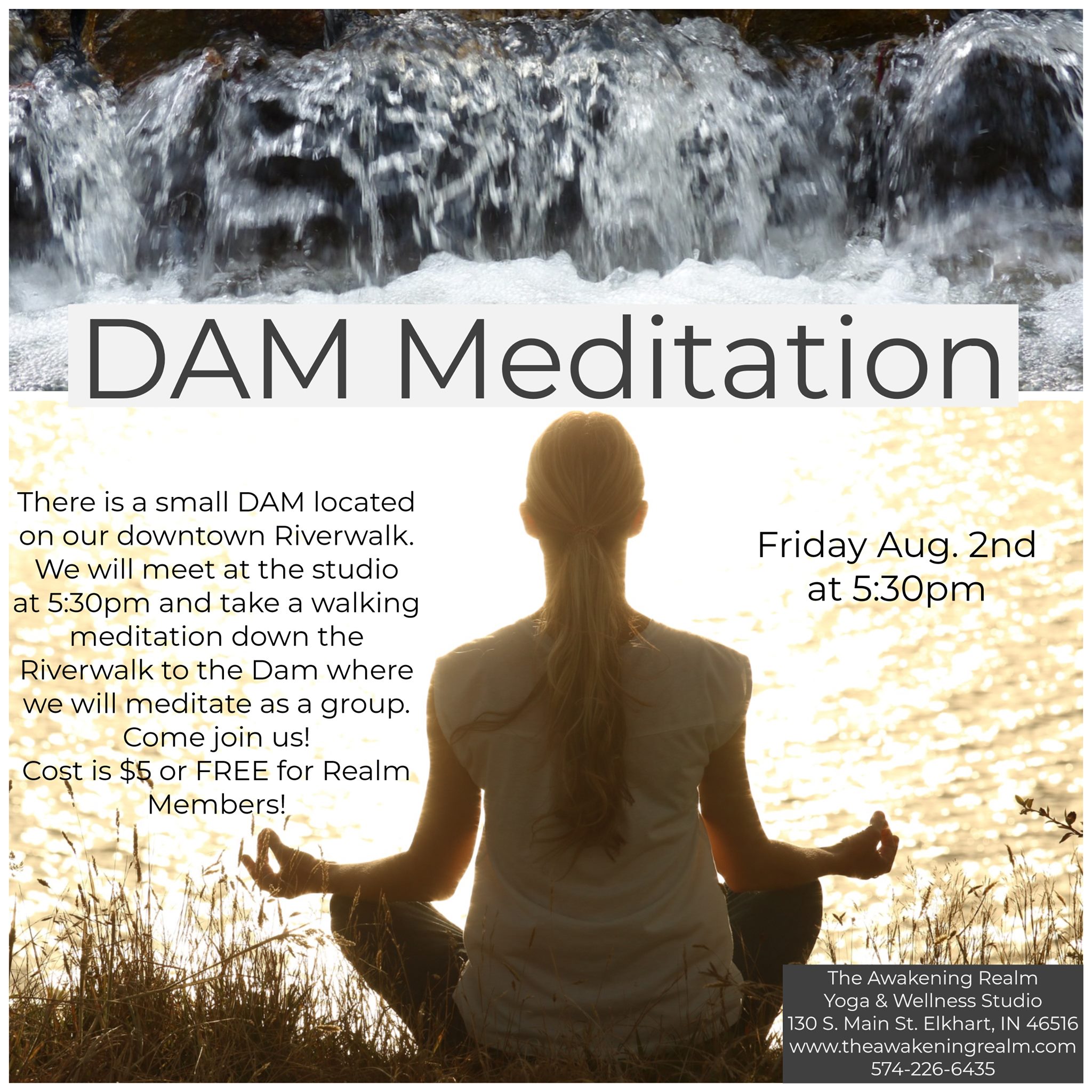 There is a small DAM located downtown Elkhart at the Riverwalk. We will meet at The Awakening Realm studio at 5:30pm and take a walking meditation down the Riverwalk to the Dam where we will meditate as a group.