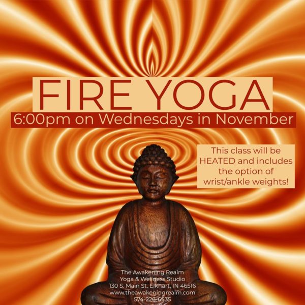 Fire yoga is a heated class! Heating the class up to 90 degrees is a great way to detox and sweat out toxins that accumulate in our bodies from stress, unhealthy foods and other yucky things we may come in contact with on a daily basis! We will move through a vinyasa practice and end in svasana with some cold wet clothes on our forehead! This class will only be on Wednesdays for the month of November! Glenn will return from his travels in December and Yin Yoga will return to Wednesday nights. So take advantage of this fun practice!