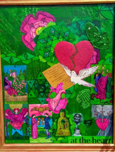 FACILITATOR, Monique Fredline has been a Tarot reader for over 40 years and has taught beginning Tarot for almost 20 years. After some years of chakra study, she intuitively connected archetypal images, such as those found in the Tarot, with images associated with the domain of each chakra, combining them to create her collage work. (The above photo is a portion of her Heart Chakra collage.) She has used this technique to deepen her understanding of the chakras and work towards healing. She is currently studying and practicing the healing art of Reiki