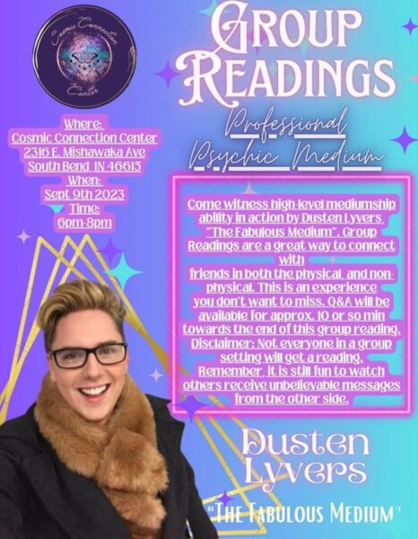 Come witness high level mediumship ability in action by Dusten Lyvers “The Fabulous Medium”,