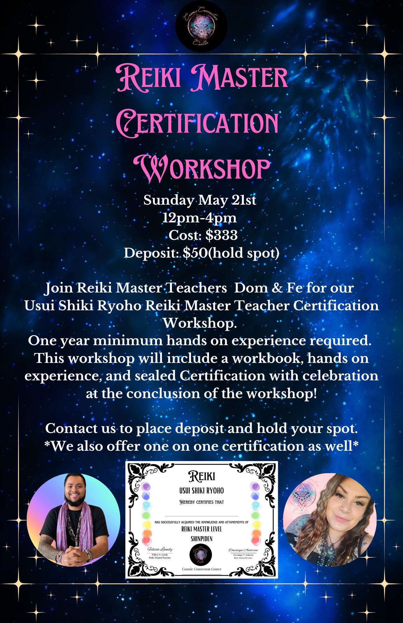 This workshop will include a workbook, hands on experience, and sealed Certification with celebration at the conclusion of the workshop! Feel free to contact us for any and all questions?