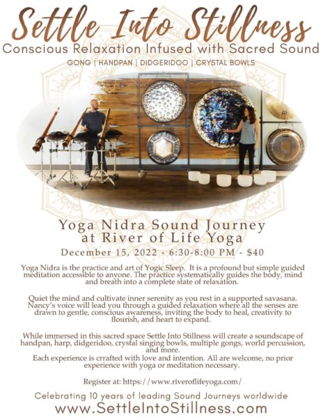 Yoga Nidra is the practice and art of Yogic Sleep. It is a profound but simple guided meditation accessible to anyone. The practice systematically guides the body, mind and breath into a complete state of relaxation. Quiet the mind and cultivate inner serenity as you rest in a supported savasana. Nancy’s voice will lead you through a guided relaxation where all the senses are drawn to gentle, conscious awareness, inviting the body to heal, creativity to flourish, and heart to expand. While in this safe, sacred space Jeremy and Nancy will create a soundscape of handpan, didgeridoo, crystal singing bowls, multiple gongs, chimes and more. Each experience is created and offered with love and intention for healing and relaxation. Receive deep rest while being immersed in the ethereal vibrations of a Yoga Nidra Sound Journey.