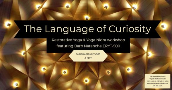 The New Year has begun! Where will it take you? Come join Barb Naranche ERYT-500 on the 3rd day following the New Moon to explore “The Language of Curiosity” in Body, Breath and Spirit as we move into 2020. The practice will spend 50 mins in restorative yoga and pranayama practice, then we will prepare for and experience the guided meditation of a yoga nidra, the sleep of yoga.